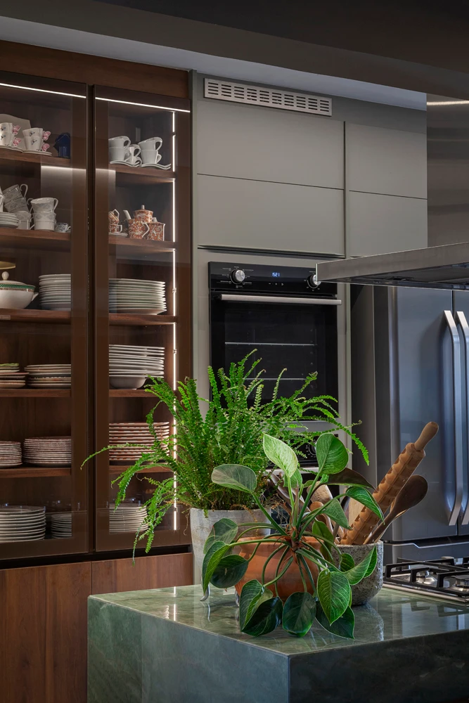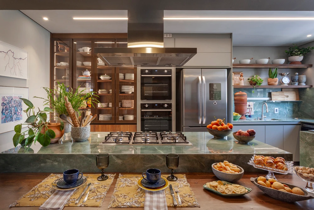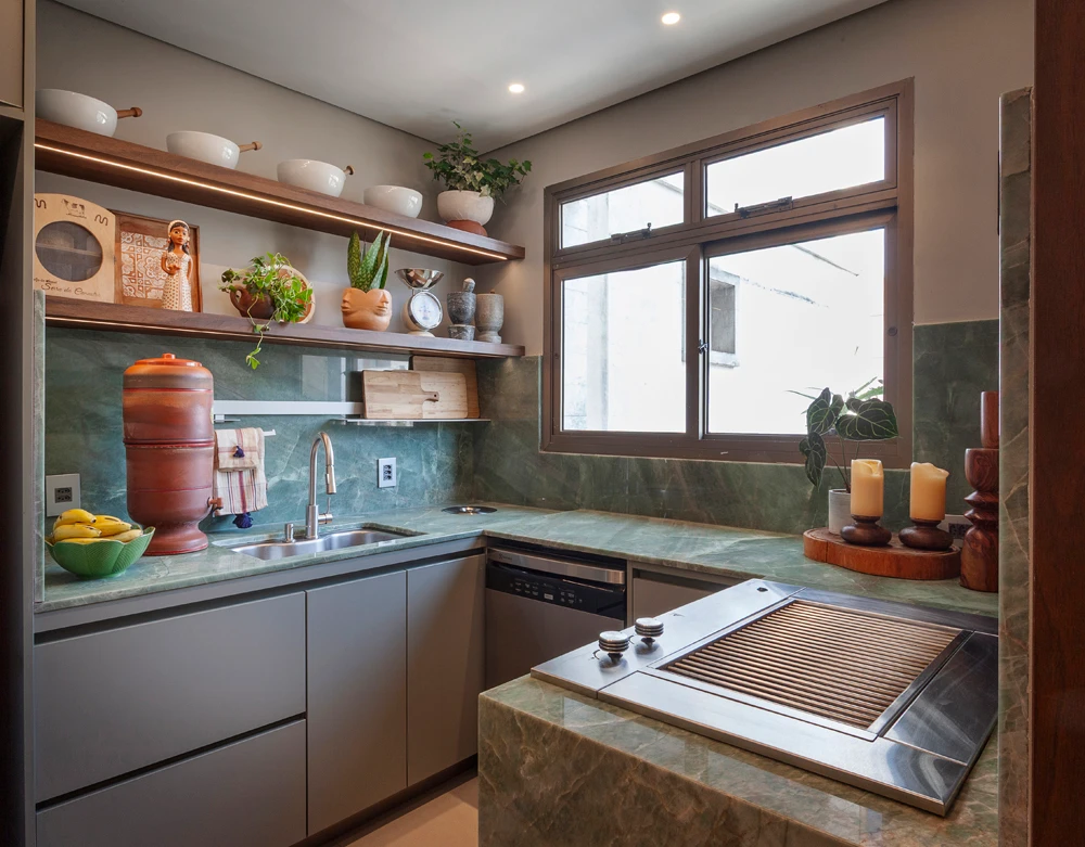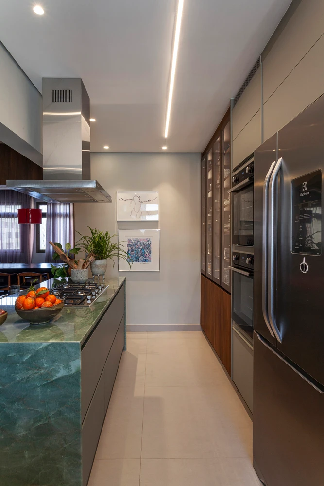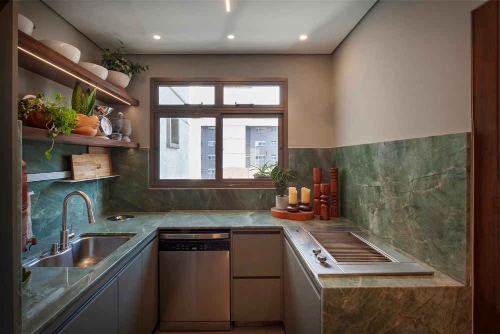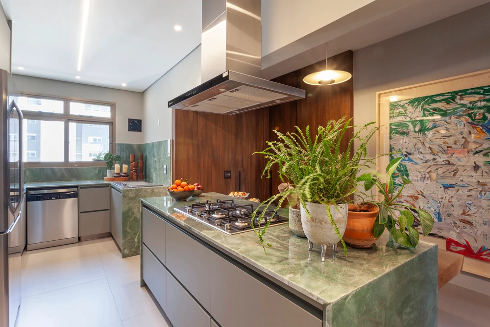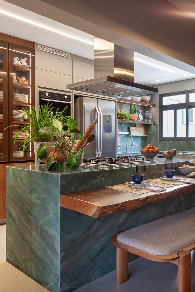 No bairro Lourdes, em Belo Horizonte, o Apartamento Geraes une o charme do design contemporâneo à riqueza dos materiais naturais, unindo adornos e peças típicas de Minas Geraes. A cozinha, marcada pela pedra verde exuberante e pelo detalhe orgânico da madeira bruta, reflete o equilíbrio entre sofisticação e acolhimento. A Doppio Arquitetura criou um projeto que valoriza a funcionalidade sem abrir mão da estética, com iluminação precisa, marcenaria sob medida e atmosfera convidativa — um lar pensado para viver bem todos os dias.