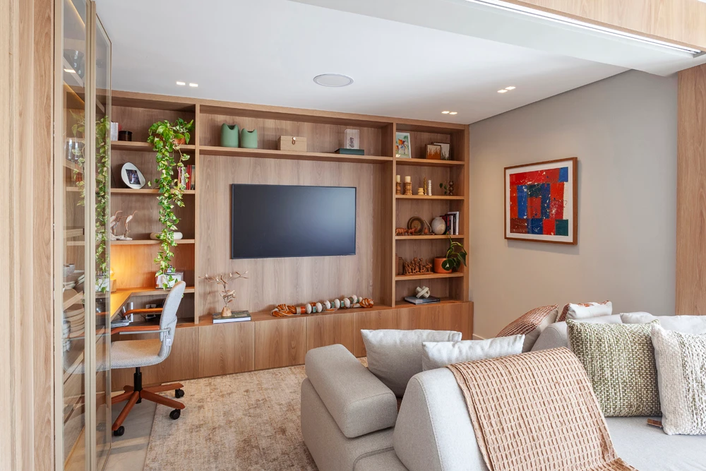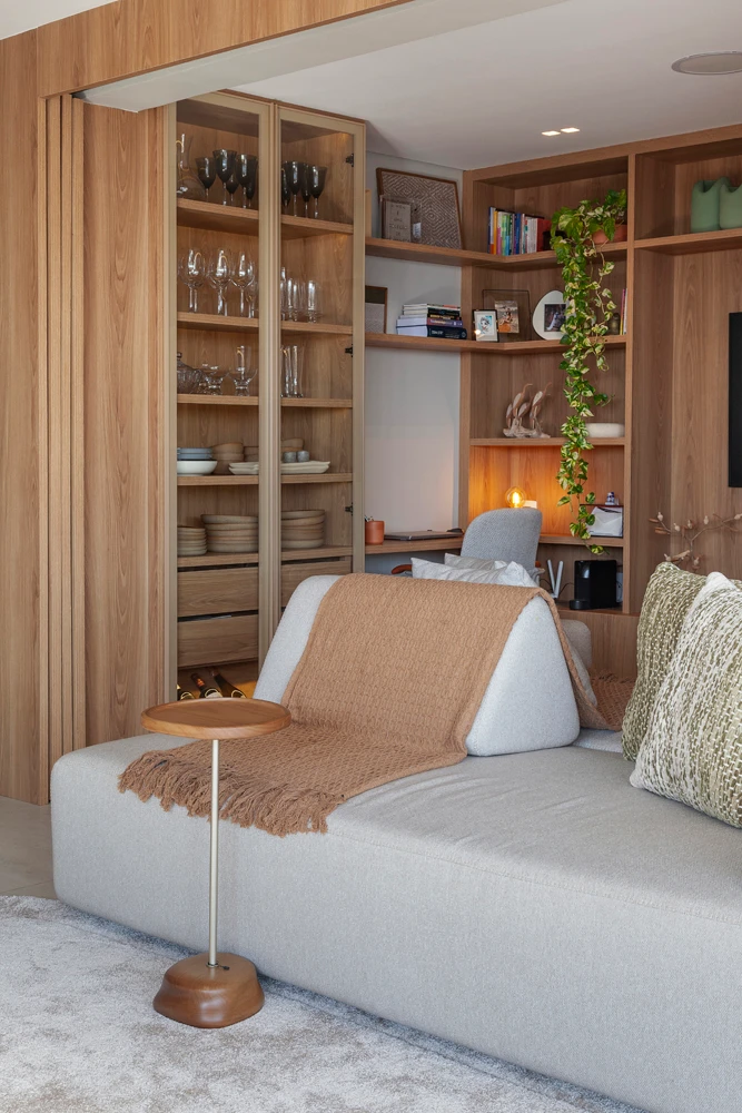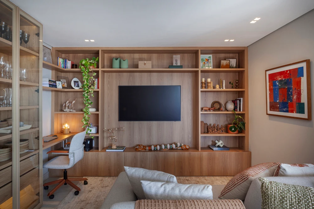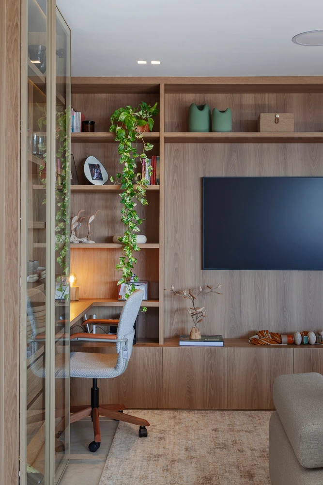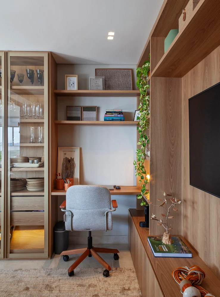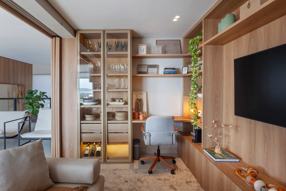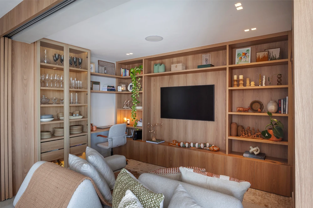 A marcenaria sob medida em madeira organiza e aquece o espaço, enquanto as portas de correr garantem privacidade para reuniões ou estadias ocasionais. A integração com a área gourmet amplia o uso da sala e reforça o conceito de um lar fluido, prático e elegante.