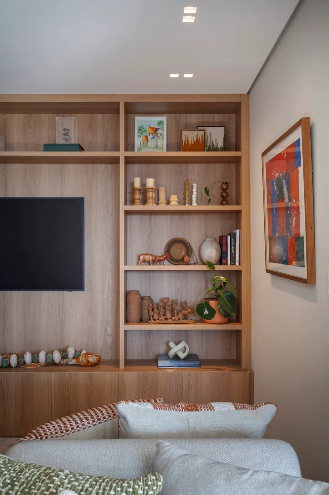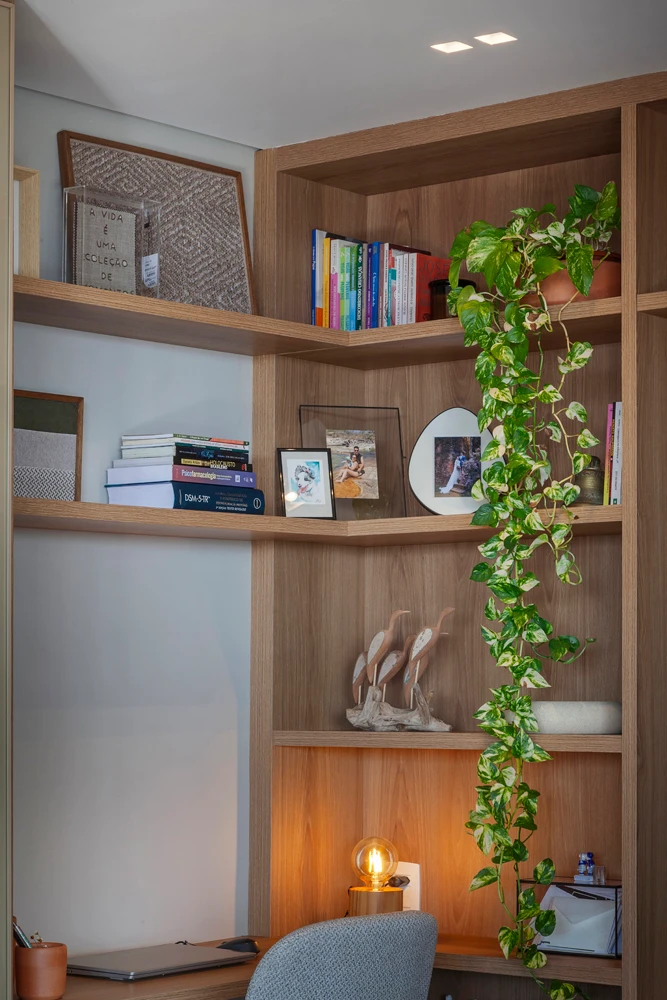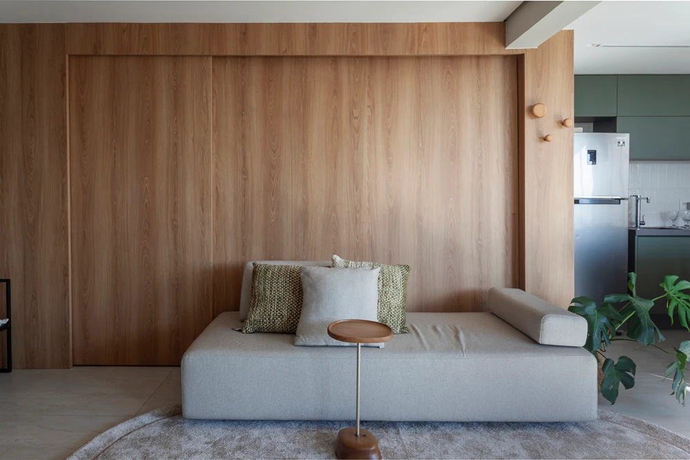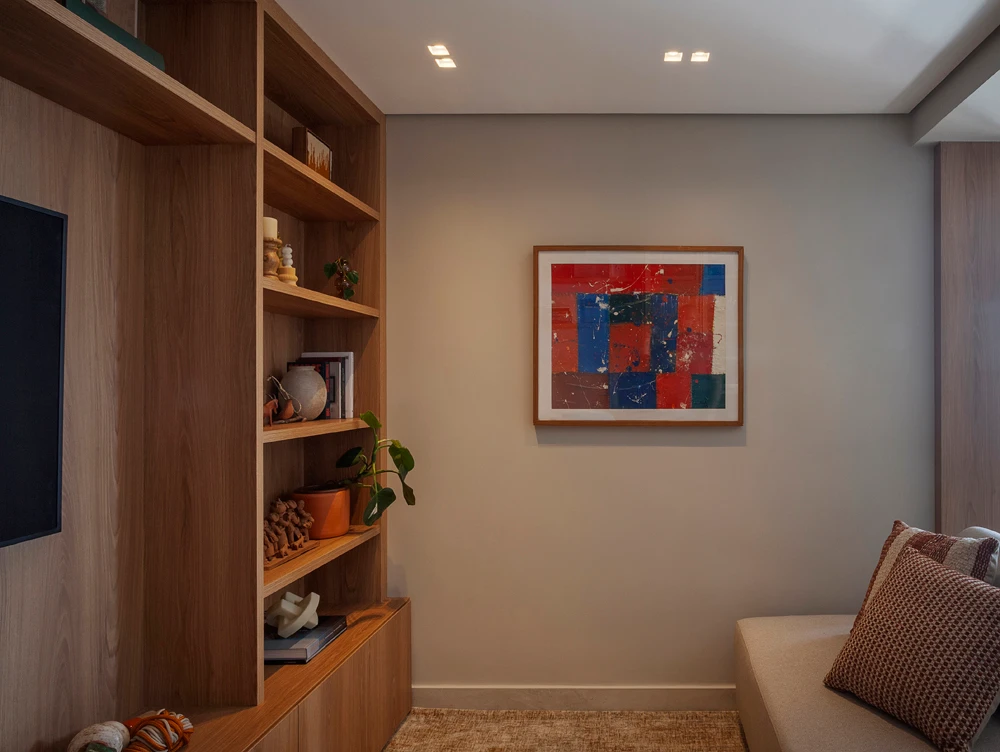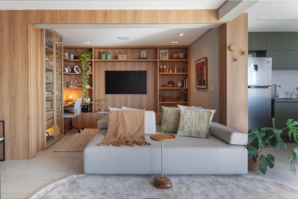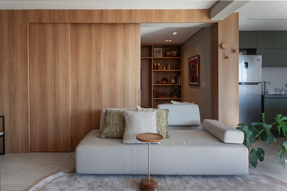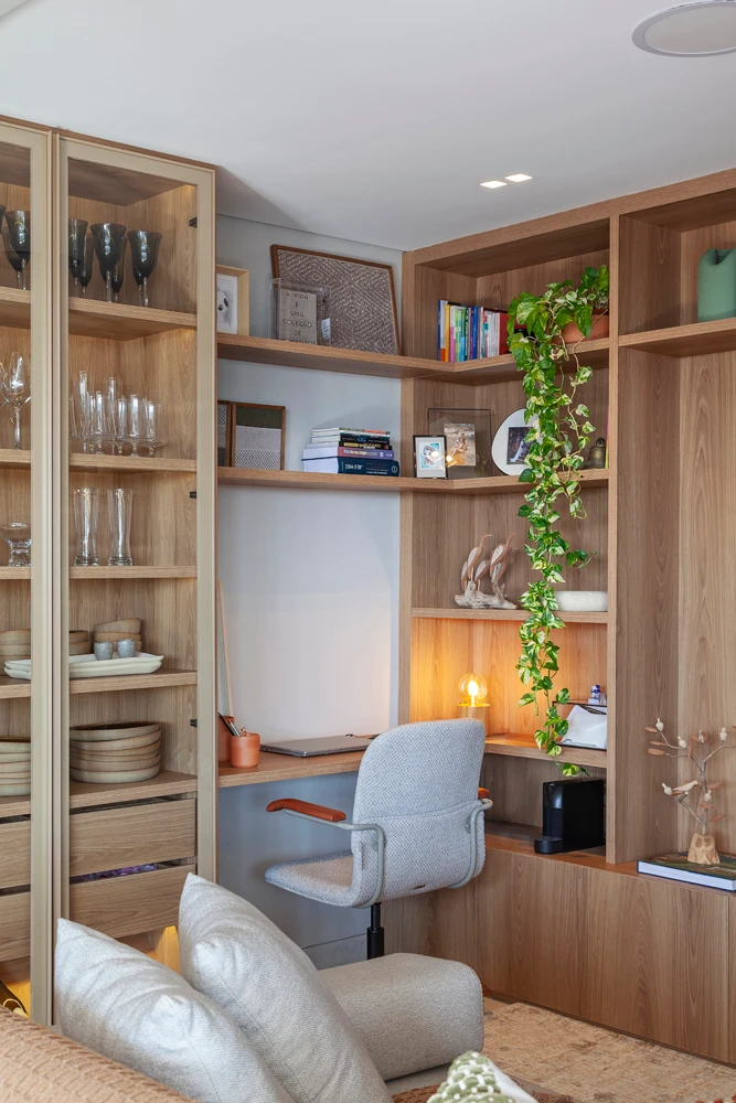 A marcenaria sob medida em madeira organiza e aquece o espaço, enquanto as portas de correr garantem privacidade para reuniões ou estadias ocasionais. A integração com a área gourmet amplia o uso da sala e reforça o conceito de um lar fluido, prático e elegante.